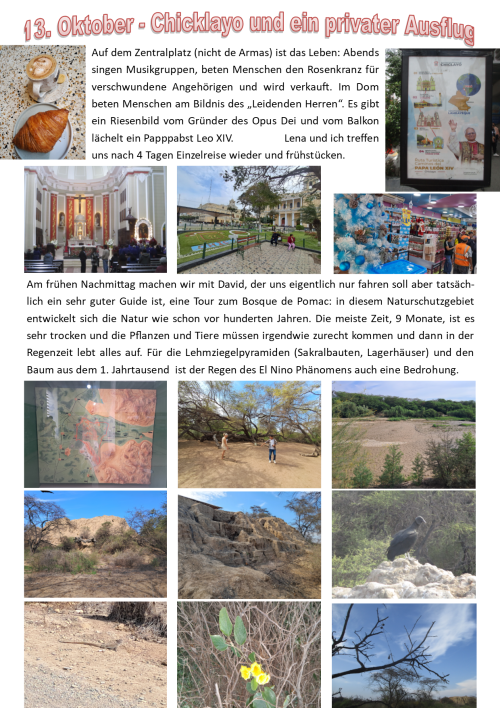 Ein Hotel im Zentrum, dass mich auch noch direkt aufgenommen hat, war mit Hilfe des Taxifahrers schnell gefunden. Nach einer erfrischenden Dusche gab es einen ersten Einblick in diese im Kern moderne Großstadt und einen besonderen individuellen Ausflug in das Sanctuario Historico Bosque de Pomac mit außergewöhnlicher Natur und besonderen Bauwerken.