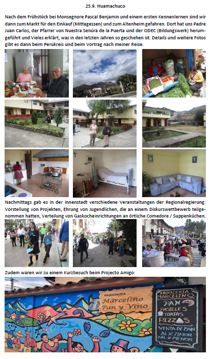 Nach meiner Einschätzung und den ersten Gesprächen ist Huamachuco in den letzten Jahren (seit 2015) gewachsen und das allgemeine Lebensniveau erscheint mir besser: Es gibt mehr gut befahrbare Straßen - die Anfahrt dauerte nur 4,5 Std. - die Verkäufe und Essensangebote finden mehr in kleinen Geschäften als auf der Straße statt und die Plaza de Armas mit den umliegenden Gebäuden hat noch an Ausstrahlung gewonnen. Es gibt wohl auch einigen Tourismus zu den Inkastätten.